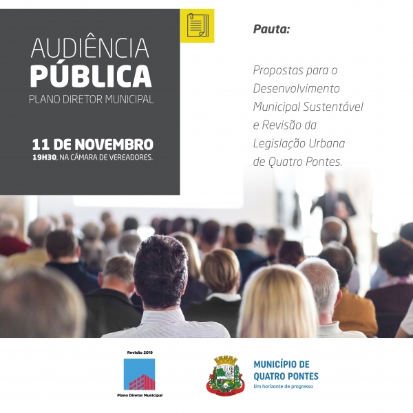 A audiência tem como pauta “Propostas para o desenvolvimento municipal sustentável e revisão da legislação urbana de Quatro Pontes”, contemplando objetivos e estratégias do desenvolvimento e do Plano Diretor Municipal e instrumentos da gestão territorial, divididos em macrozoneamento municipal e zoneamento urbano e diretrizes para os instrumentos normativos, urbanísticos e do sistema de gestão.