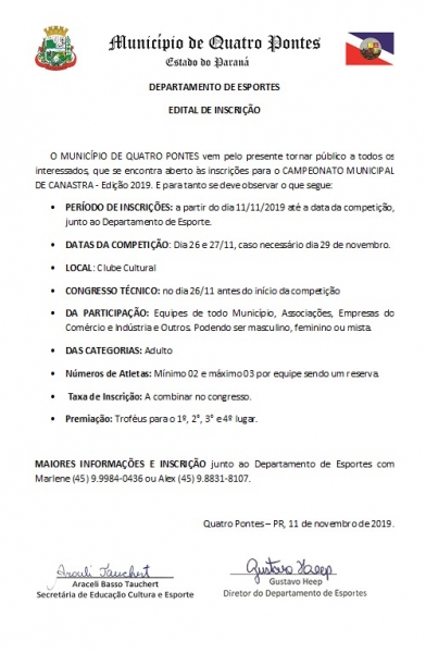 📞📞 Mais informações e inscrição junto ao Departamento de Esportes, com Marlene (45) 99984-0436 ou Alex (45) 98831-8107. 📞📞