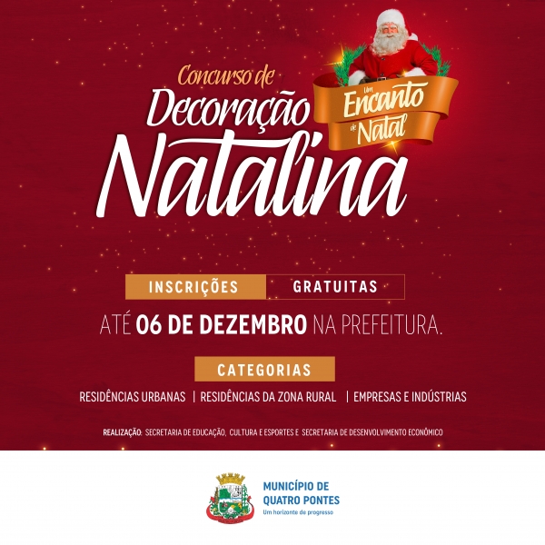As Secretarias de Educação, Cultura e Esportes e de Desenvolvimento Econômico, de Quatro Pontes, encerram nesta sexta-feira (06) as inscrições do Concurso de Decoração Natalina “Um Encanto de Natal”, nas categorias residências urbanas, residências da zona rural e empresas e indústrias. Os interessados devem preencher a ficha gratuitamente na recepção da prefeitura até às 17 horas.