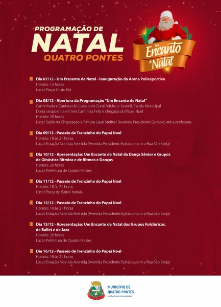 A partir das 20 horas de domingo (15), a programação “Um Encanto de Natal”, de Quatro Pontes, terá sequência com as apresentações dos grupos folclóricos, coordenados pelo professor Marcio Cristiano da Silva, e de jazz e ballet, coordenados pela professora Andreia Kracke Luchtenberg, em frente à prefeitura. Após as apresentações, o Papai Noel também receberá as crianças em sua casa.