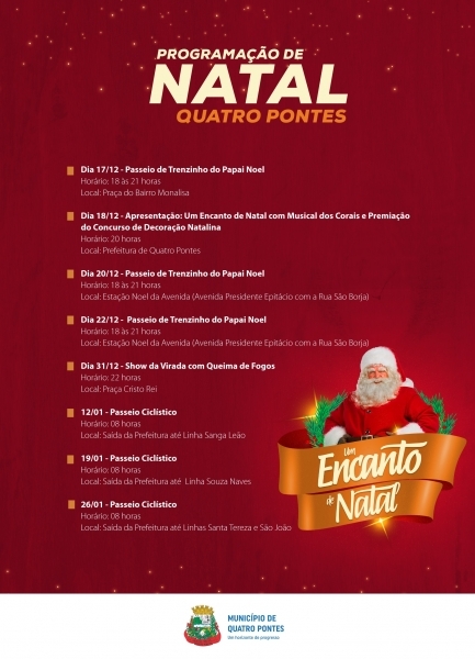 Hoje (18), a partir das 20 horas, os corais infantil, juvenil e adulto farão um musical, encerrando as apresentações da programação “Um Encanto de Natal”, organizada pela Secretaria de Educação, Cultura e Esportes, de Quatro Pontes. Devido à instabilidade do tempo, o evento terá como palco o Centro de Eventos Seno José Lang, sendo gratuito.