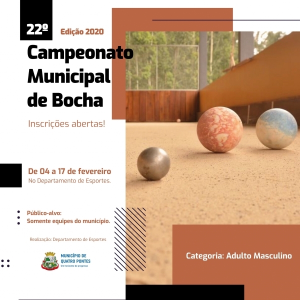Estão abertas desde terça-feira (04), seguindo até o próximo dia 17, as inscrições ao 22º Campeonato Municipal de Bocha, edição 2020, em Quatro Pontes. A competição, que é organizada pelo Departamento de Esportes, é na categoria adulto masculino e voltada apenas para equipes do município, desde associações, empresas do comércio e indústria e outros.