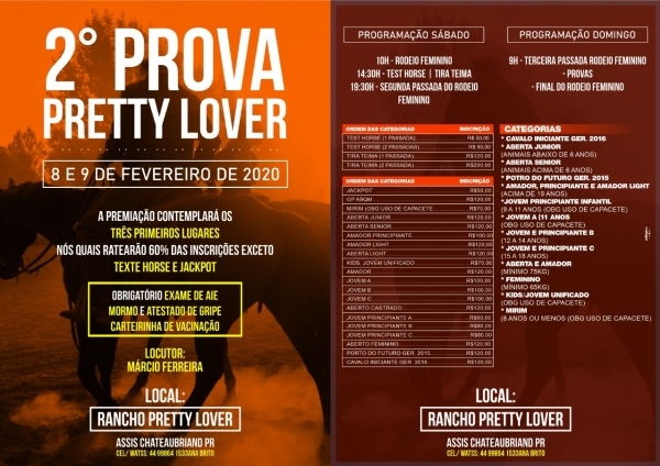 A programação iniciará às 10 horas de amanhã com o rodeio feminino. Às 14h30 terá as provas de Test Horse e Tira Teima. Já às 19h30, acontecerá a segunda passada do rodeio feminino. No domingo, a terceira passada do rodeio feminino começará às 09 horas, seguido de provas e da final.