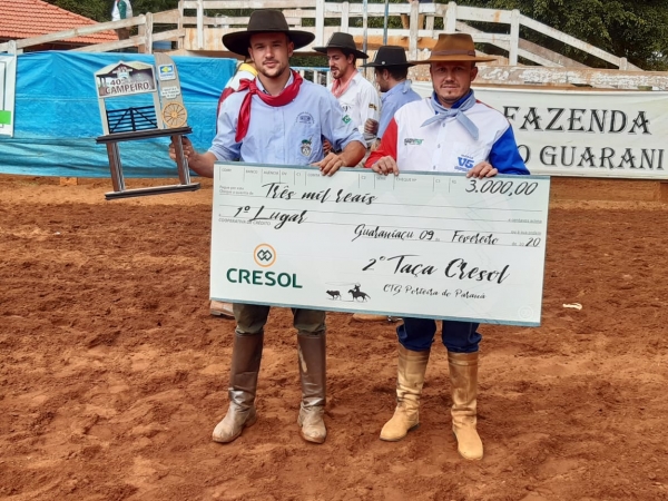 Disputando pela 2ª Taça Cresol, Gustavo Laufer, de Quatro Pontes, conquistou o 1º lugar na laçada em dupla no 40º Encontro Cultural e Campeiro, realizado pelo C.T.G Porteira do Paraná, em Guaraniaçu, de sexta-feira (07) a domingo (09). Na Taça Prata, Gustavo competiu pela equipe Força B, formada por cinco laçadores, que ficou vice-campeã. Esta modalidade reuniu 70 equipes.