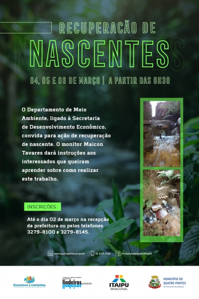 O Departamento de Meio Ambiente, de Quatro Pontes, está com inscrições abertas para ação de recuperação de três novas nascentes no interior do município, por intermédio de convênio com a Itaipu Binacional, através do Programa Encontros e Caminhos, e da Secretaria de Desenvolvimento Econômico, além de apoio do Conselho de Desenvolvimento dos Municípios Lindeiros ao Lago de Itaipu. Elas devem feitas até o dia 02 de março, na recepção da prefeitura ou através dos telefones 3279-8100 e 3279-8145, sem custo.