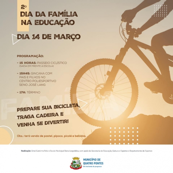 O Centro Municipal de Educação Infantil (Cmei) Cantinho Feliz e a Escola Municipal Dona Leopoldina, com apoio da Secretaria de Educação, Cultura e Esportes, de Quatro Pontes, realiza neste sábado (14) o 2º Dia da Família na Educação. A programação terá início às 15 horas com passeio ciclístico. A saída será em frente à escola, passando pela Avenida Presidente Epitácio, até o Centro de Eventos Seno José Lang.