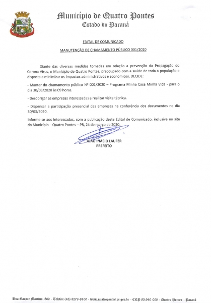 Diante das diversas medidas tomadas em relação à prevenção da propagação do coronavírus, o Município de Quatro Pontes, preocupado com a saúde de toda a população e disposto a minimizar os impactos administrativos e econômicos, DECIDE: