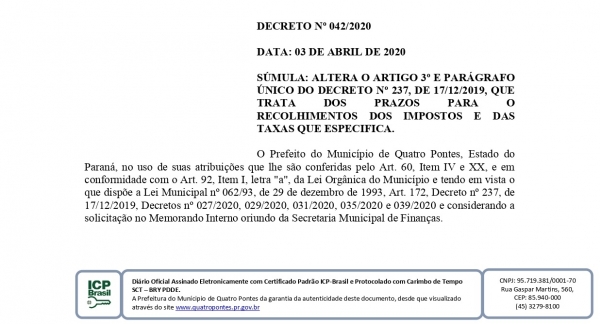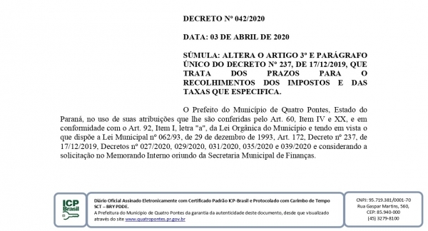 O prefeito de Quatro Pontes, João Inácio Laufer, alterou os prazos para os recolhimentos de impostos e taxas. De acordo com o decreto nº 042/2020, de 03 de abril de 2020, fica, então, prorrogado o vencimento da Taxa de Verificação de Funcionamento Regular dos Estabelecimentos de Produção, Comércio, Indústria e de Prestação de Serviços (alvará), relativo ao exercício de 2020, por 90 dias.