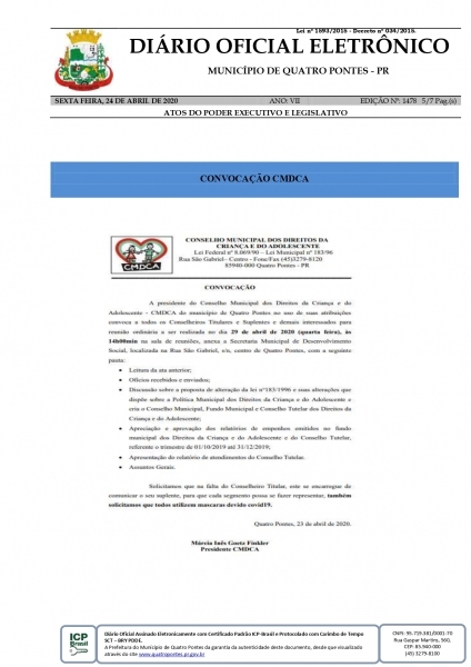 A presidente do Conselho Municipal dos Direitos da Criança e do Adolescente (CMDCA) de Quatro Pontes, no uso de suas atribuições, convoca todos os conselheiros titulares e suplentes e demais interessados para reunião ordinária a ser realizada amanhã (29), às 14 horas, na sala de reuniões anexa à Secretaria de Desenvolvimento Social.