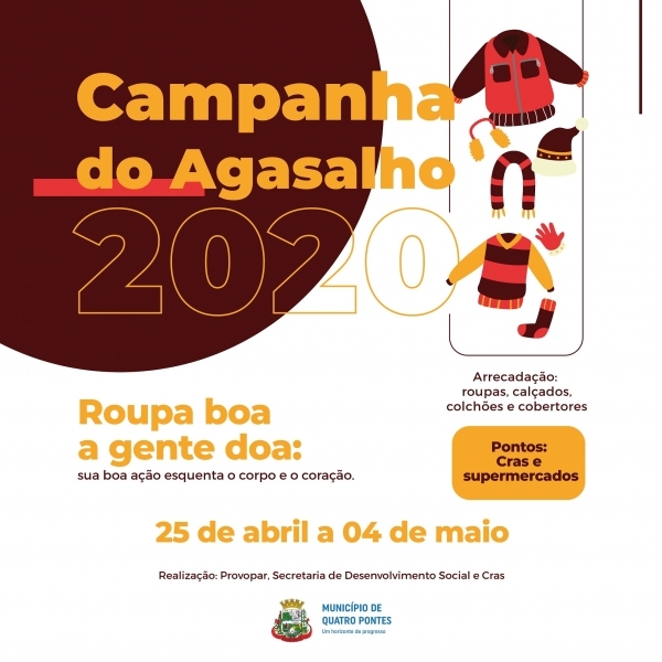 Hoje (04), o Provopar, Secretaria de Desenvolvimento Social e o Centro de Referência de Assistência Social (Cras), de Quatro Pontes, encerram o período de arrecadação de doações para a Campanha do Agasalho 2020, intitulada “Roupa boa a gente doa: sua boa ação esquenta o corpo e o coração”. Interessados podem contribuir com roupas, calçados, colchões e cobertores em bom estado. O Cras e os supermercados são os pontos de arrecadação.