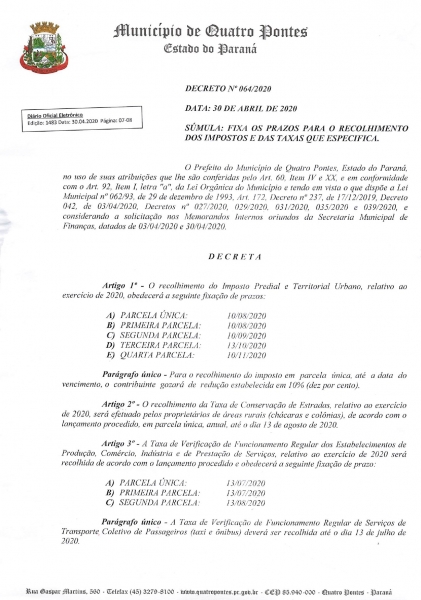 A Prefeitura de Quatro Pontes, através da Secretaria de Finanças, publicou o decreto nº 064/2020, de 30 de abril de 2020, fixando prazos para recolhimento de impostos e taxas, considerando a pandemia do novo coronavírus (Covid-19) e a dificuldade financeira que se abateu sobre todos os contribuintes entorno do isolamento social e demais restrições que abalam a economia neste momento.