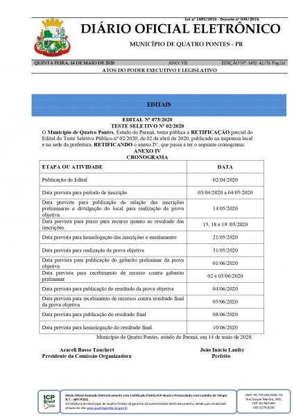 A Prefeitura de Quatro Pontes publicou, no último dia 14, no Diário Oficial, a retificação parcial do edital do teste seletivo público nº 02/2020, de 02 de abril de 2020, alterando o cronograma. Assim, a data prevista para realização da prova objetiva é o próximo dia 31. O processo seletivo visa o preenchimento de empregos públicos, com uma vaga para contratação imediata no cargo de técnico em segurança do trabalho e de cadastro de reserva para agente comunitário de saúde na prefeitura.