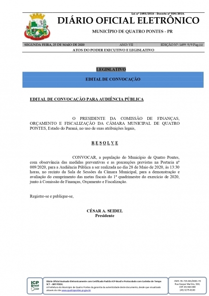 Com base nas exigências da Lei de Responsabilidade Fiscal, a Secretaria de Finanças, de Quatro Pontes, promoverá às 13h30 de quinta-feira (28), junto à Câmara de Vereadores, audiência pública para prestação de contas sobre a arrecadação e aplicação dos recursos que compõem o orçamento do município. A demonstração e avaliação do cumprimento das metas fiscais do 1º quadrimestre de 2020 será realizada pelo contador da prefeitura, Juliano Lang.
