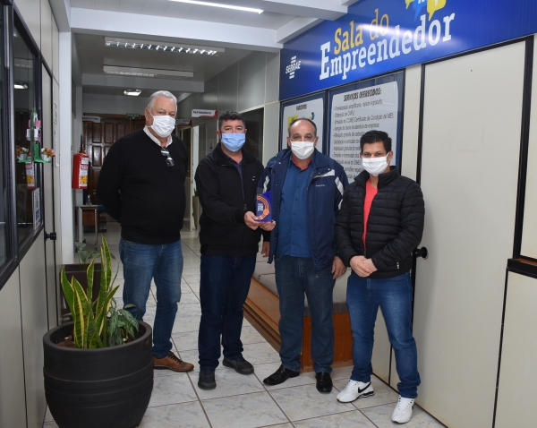 Na foto, o prefeito João Inácio Laufer, acompanhado do secretário de Desenvolvimento Econômico, Rudi Kuns, do diretor do Departamento de Fomento à Indústria, Comércio, Serviços e Turismo, Gerson Luis Perius, e do agente de desenvolvimento da Sala do Empreendedor, Tiago F. Domingues, comemoram o recebimento do troféu.