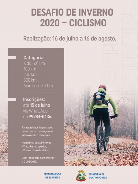 Na quarta-feira (15), o Departamento de Esportes, de Quatro Pontes, encerrará o prazo de inscrições ao Desafio de Inverno de Ciclismo 2020. Gratuitas, elas devem ser feitas exclusivamente via WhatsApp, no telefone 99984-0436. Se faz necessário preencher e devolver a ficha. A competição é destinada apenas para pessoas de Quatro Pontes, que precisam ter vínculo com o município, como residir ou possuir imóvel, ou trabalhar, ou estudar ou possuir título de eleitor, tudo com data anterior a 1º de março de 2020.