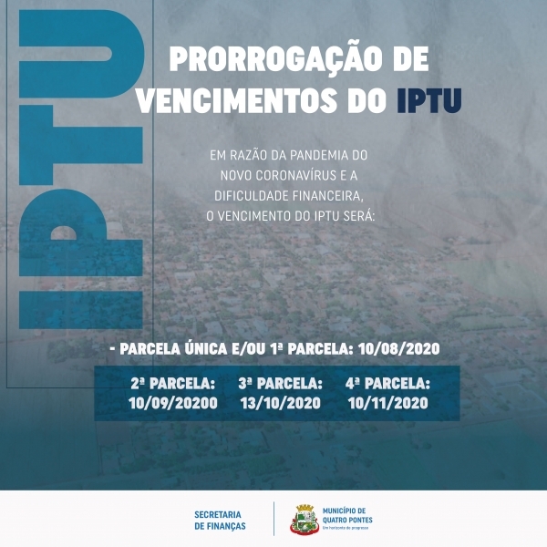 A prefeitura prorrogou para agosto os vencimentos do IPTU em razão da pandemia do novo coronavírus (Covid-19) e a dificuldade financeira que se abateu sobre todos os contribuintes entorno do isolamento social e demais restrições que abalam a economia neste momento.