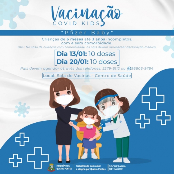 A Secretaria de Saúde de Quatro Pontes aplicará a vacina Covid Kids na sexta-feira (13), com disponibilidade de dez doses. Trata-se de orientações do Ministério da Saúde, a fim de oferecer o imunizante “Pfizer Baby” às crianças de seis meses a três anos incompletos, com e sem comorbidade.