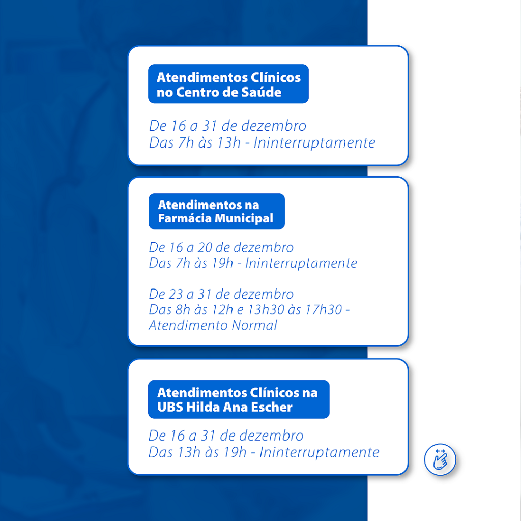 24/12/2024 - Atendimento realizado na Unidade Básica de Saúde Hilda Ana Escher, das 07h00 às 13h00.